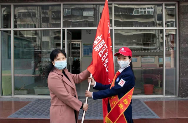 趙校長(zhǎng)為學(xué)雷鋒服務(wù)隊(duì)授旗