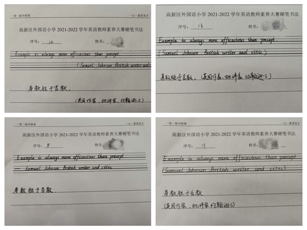 小學(xué)是學(xué)生學(xué)習(xí)成長(zhǎng)的奠基階段,良好的書(shū)寫(xiě)習(xí)慣離不開(kāi)老師的示范引領(lǐng)。英語(yǔ)文本的規(guī)范書(shū)寫(xiě)和正確翻譯,是英語(yǔ)教師的基本功。學(xué)科組采用現(xiàn)場(chǎng)抽簽、臨時(shí)書(shū)寫(xiě)翻譯的形式,對(duì)英語(yǔ)組全體教師的基本功進(jìn)行了全面考查。工整、精美的作品體現(xiàn)出精湛的技藝。