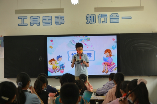 “我給大家推薦的書籍是《魯賓遜漂流記》……”。各班教室里很是熱鬧,“好書推介會”正在進行,“小小書蟲”能說會道,將自己喜歡的書籍推薦給同年級的伙伴們。臺上講得頭頭是道,臺下聽得津津有味,濃濃的讀書氣氛中充滿歡聲笑語,好書因分享而增值,閱讀因傳播而美麗。