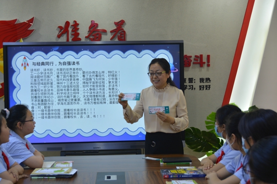 尋覓著遠處的讀書聲,走進一樓少年隊活動室。瞧,“跟著校長去讀書”閱讀欄目正在如火如荼的進行著。學校黨支部書記、校長孫冬梅正帶領少先隊員們暢游書海,探索科學的秘密。她還結合當下時事,以神舟十三號飛船返回地球為出發(fā)點,引導孩子們暢談中國航天的發(fā)展歷程,幼小的心靈已悄然種下探索科學的種子,愛國主義情懷也在閱讀探索中不斷生發(fā)。交流分享會、撰寫讀書卡、自編自創(chuàng)閱讀三句半、贏得閱讀幣……孩子們享受著閱讀帶來的快樂。欄目開設以來,跟著校長去讀書已成為校園新風尚,博學多才的校長媽媽成為了孩子們追尋的“星”。