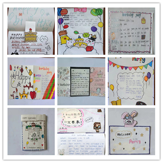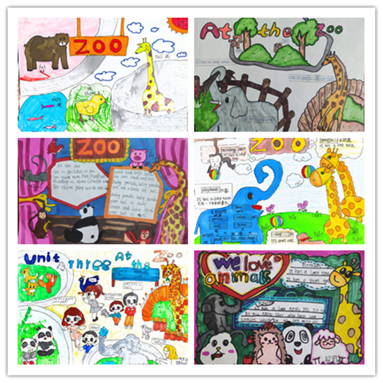 其中三年級英語以第四單元Atthezoo為主題,學生繪制了高矮胖瘦不同的動物,并介紹其長鼻子小眼睛等細節(jié)特征。四年級英語以Atmyfarm為主題,巧妙布局的同時加入蔬菜和動物等手繪圖片及英文單詞,同學們奇思妙想,呈現(xiàn)出一幅幅美輪美奐的農(nóng)場景象。五年級以"我的生日邀請函"為主題,學生們個個熱情高漲,充分展現(xiàn)了自己的繪畫天賦以及無限的創(chuàng)造力,學生們的作品制作精美,處處顯現(xiàn)著他們的用心。通過這次活動,學生們不僅學會了邀請函的書寫格式,也極大的激發(fā)了學生學習英語的興趣。