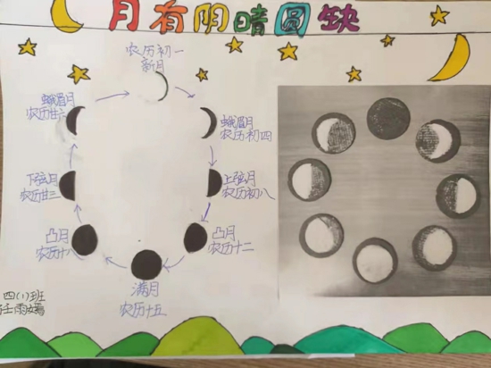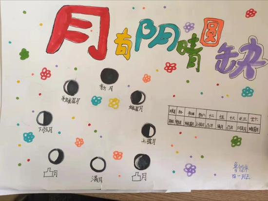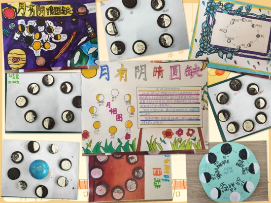 此次特色作業(yè)展示活動由學(xué)?茖W(xué)老師精心組織策劃,各年級學(xué)生積極參與,科學(xué)老師在傳統(tǒng)作業(yè)的基礎(chǔ)上,設(shè)計了一些獨特的作業(yè)。“可憐九月初三夜,露似真珠月似弓”,“楊柳岸曉風(fēng)殘月”、“思君如滿月、夜夜減清輝”,美妙的詩詞背后,描述了不同的月相,科學(xué)上學(xué)了“月相”之后,在開展了以“月有陰晴圓缺”為主題的綜合實踐活動后,為了讓孩子們深入了解月相的變化,孩子們開放思維、大顯身手,展示出了別樣的月亮,有奧利奧做的月亮,有手繪的月亮,形態(tài)各異,豐富多彩。同學(xué)們的每一份特色作業(yè)就是一個作品、一種創(chuàng)新、一份享受,每一件作品都展現(xiàn)了“紫東”學(xué)子們的智慧之光,展現(xiàn)了他們創(chuàng)新的腳步。