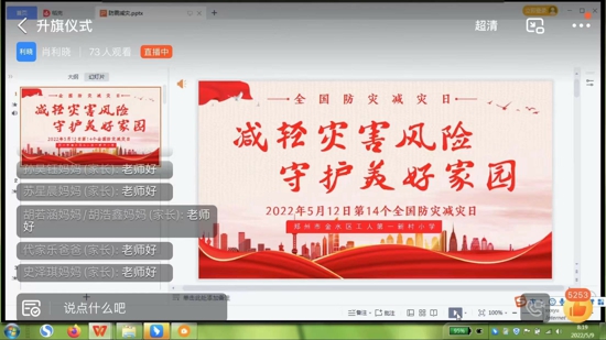 中新河南網(wǎng)5月11日電(吳勇強(qiáng)和丹丹)為提高學(xué)生的消防安全意識和防火滅火能力,鄭州市金水區(qū)工人第一新村小學(xué)各班于5月9日組織開展升旗儀式和防震減災(zāi)主題班會。