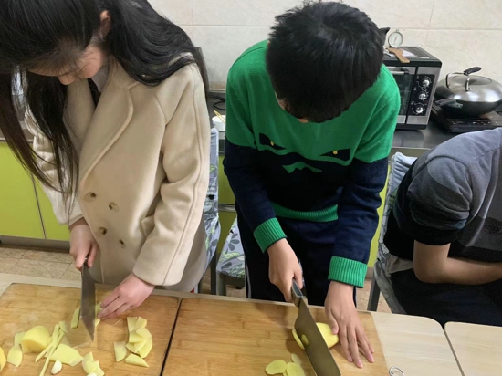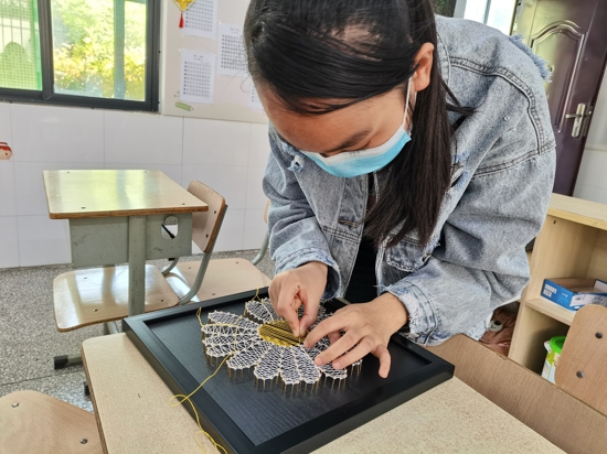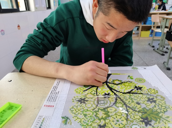 近年來,學(xué)校著重培養(yǎng)高年級學(xué)生的生活技能,為之后的生活、就業(yè)做準(zhǔn)備。勞技課上,同學(xué)們學(xué)習(xí)洗菜、切菜、炒菜、煮面條、熬粥;家政課上,同學(xué)們學(xué)習(xí)整理被褥、疊衣服;手工課上,同學(xué)們學(xué)習(xí)編織、繞釘畫、鉆石畫等手工制作。在老師的幫助下,學(xué)生通過不斷地練習(xí),這些勞動(dòng)技能已經(jīng)可以熟練掌握。