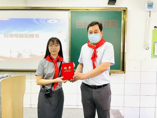 孫校長(zhǎng)為新隊(duì)員佩戴紅領(lǐng)巾