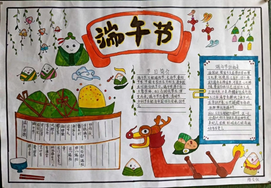 活動(dòng)中,老師帶領(lǐng)學(xué)生們了解了端午節(jié)的來歷,通過老師的講解,學(xué)生們知道了端午節(jié)是我國傳統(tǒng)節(jié)日中別名最多的一個(gè)節(jié)日,除了常說的端陽節(jié)、五月節(jié),也別稱為重午節(jié)、天中節(jié)、龍舟節(jié)......近30個(gè)別稱。作為我國的傳統(tǒng)節(jié)日,端午至今已經(jīng)有兩千多年的歷史,端午節(jié)別名多,說明端午習(xí)俗起源的多樣和龐雜。關(guān)于端午節(jié)的風(fēng)俗更可以說是“百里不同風(fēng),千里不同俗。”聽完老師的講解同學(xué)們不經(jīng)感嘆祖國歷史文化的厚重與廣博。課下,學(xué)生們還通過制作端午節(jié)手抄報(bào)、分享端午詩詞、制作折紙粽子、折紙龍舟等手工作品營造節(jié)日氛圍,回到家后和家人們一起包粽子……