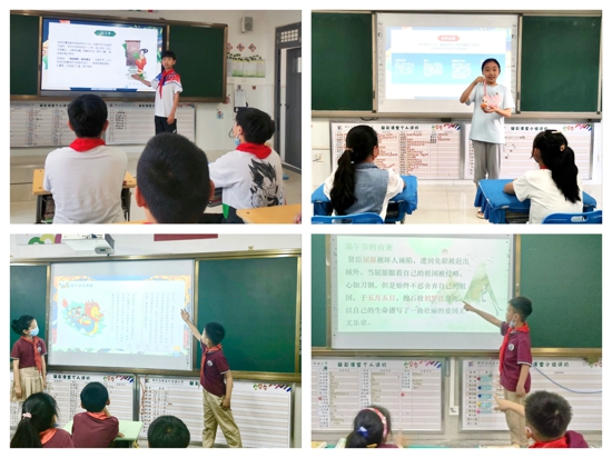 “節(jié)分端午自誰(shuí)言,萬(wàn)古傳聞為屈原?靶Τ彰烀欤荒芟吹弥背荚。”端午節(jié)在古代是紀(jì)念屈原的節(jié)日。隊(duì)會(huì)課上,學(xué)生們了解到兩千多年前楚國(guó)詩(shī)人、政治家屈原憂國(guó)憂民的事跡,深深感受他的愛(ài)國(guó)情懷。