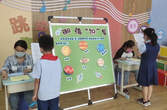 活動前期,老師們結(jié)合現(xiàn)階段學(xué)生興趣,聯(lián)系課文《太空生活趣事多》,為二年級學(xué)生精心設(shè)置了喜聞樂見的太空關(guān)卡,其中共設(shè)置了6個關(guān)卡:“誦”入云霄、“吟”河暢游、瀚海“識”星、“閱”球探秘、“基”石之戰(zhàn)、暢聊宇宙。通過太空歷險的游戲方式設(shè)置,分別對背誦、朗讀、識字、閱讀、寫字及口語交際進行全方位、多角度評價。
