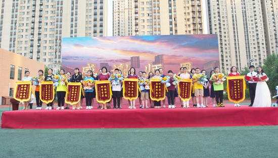 學(xué)生和家長代表為老師頒獎(jiǎng),為學(xué)校、班主任和任課教師送上錦旗、鮮花和象征永久紀(jì)念的出彩石,表達(dá)無盡的感謝!