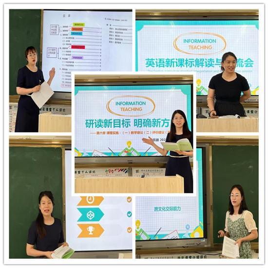 英語組王雅璞老師、李蕊蕊老師、王亞老師、袁凱麗老師和五龍口校區(qū)蘇冉老師從不同角度解讀了新課標(biāo)對我們的深厚內(nèi)涵。王雅璞老師從課程性質(zhì)、課程理念和課程目標(biāo)三個角度進行分析,強調(diào)了“學(xué)思結(jié)合,用創(chuàng)為本”的英語學(xué)習(xí)活動觀;李蕊蕊老師從課程內(nèi)容入手,帶領(lǐng)各位老師從主題、語篇、語言知識、文化知識、語言技能和學(xué)習(xí)策略等要素學(xué)習(xí)新課標(biāo);王亞老師圍繞學(xué)業(yè)質(zhì)量板塊進行了研討學(xué)習(xí),為老師們在教學(xué)實踐中真正全面把握學(xué)業(yè)質(zhì)量標(biāo)準(zhǔn)、落實英語學(xué)科核心素養(yǎng)指明了方向;袁凱麗老師和蘇冉老師分別從不同角度分析了課程實施,袁凱麗老師圍繞“教學(xué)建議”和“評價建議”兩項內(nèi)容展開解讀,強調(diào)教師應(yīng)深入開展語篇研讀,必須走出只抓“語言”,不見“文化”的實踐誤區(qū);蘇冉老師圍繞“教材編寫建議”、“課程資源開發(fā)與利用”和“教學(xué)研究與教師培訓(xùn)”三項內(nèi)容展開解讀,并結(jié)合對新課標(biāo)的理解和平時的教學(xué)提出了自己的見解和建議。