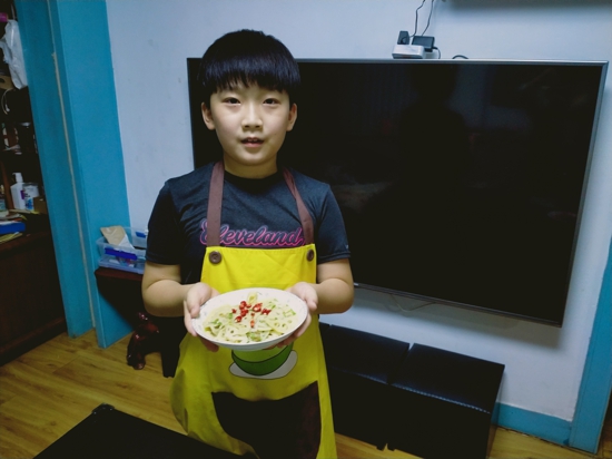 五年級賀耀弘分享道:“在班會課上,我了解到了以前勞動人民有吃頭伏餃子的習俗。于是,我在媽媽的指導下開始學習和面、盤餡兒、包餃子,解鎖了多項新技能。吃著餃子,享受著自己的勞動成果,果然有一種不同尋常的美。”