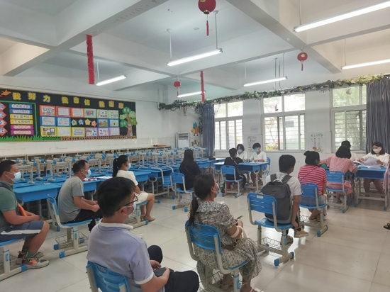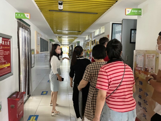 引導老師根據(jù)小區(qū)帶家長進入各組的審核區(qū),學校共安排9組老師進行材料審核,大大提高了審核的速度和準確度。
