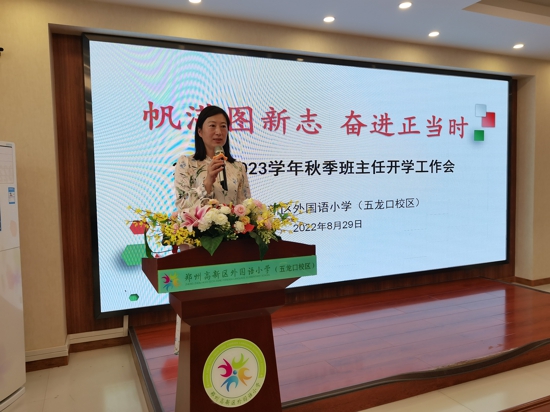 中新河南網(wǎng)9月1日電(吳勇強(qiáng))2022年8月29日上午, 鄭州高新區(qū)外國(guó)語(yǔ)小學(xué)五龍口校區(qū)召開(kāi)了以”帆滿圖新志奮進(jìn)正當(dāng)時(shí)”為主題的新學(xué)期班主任工作會(huì)議。會(huì)議由德育處主任于姍姍主持,校長(zhǎng)韓輝、副校長(zhǎng)于艷麗、書(shū)記任高尚和全體班主任教師參加了會(huì)議。
