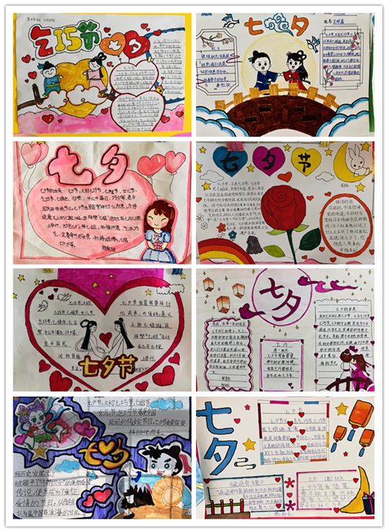 當(dāng)暑假遇上七夕,孩子們自主創(chuàng)造七夕小報,加深了孩子們對傳統(tǒng)節(jié)日的理解,一張張小小的畫紙經(jīng)過孩子們靈巧的雙手,一瞬間就變得色彩斑斕,妙趣橫生。