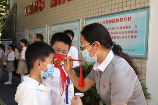 朱砂啟智開天眼,一撇一捺學(xué)做人,學(xué)校領(lǐng)導(dǎo)在校門口為走進(jìn)校園的每一位“工一娃”點(diǎn)上一顆“智慧”的朱砂。朱砂點(diǎn)落,從此眼明心亮,好讀書,讀好書。顆顆紅“智”飽含著父母、長(zhǎng)輩、學(xué)校的殷殷期待和美好祝愿,更凝結(jié)著中華五千年文化的悠悠情節(jié)。