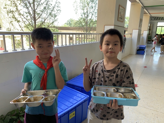 午餐后,三年級學(xué)生們也向一年級新生展示如何倒餐,用實(shí)際行動展現(xiàn)了文明用餐禮儀,并用一個個“空盤”“空碗”告訴我們—“光盤”,大家在行動。