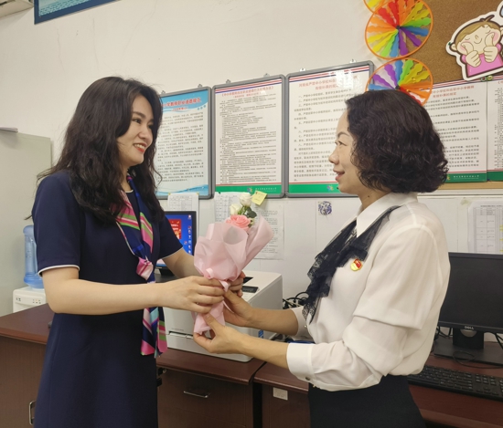 辦公室,走廊上,圖書角……外小校務班子領導將鮮花送到每位老師手中,一聲問候,一份溫暖,洋溢在校園的每一個角落,流淌在每一位教師的心中,自豪感、幸福感油然而生,教書育人的初心則更為堅定。