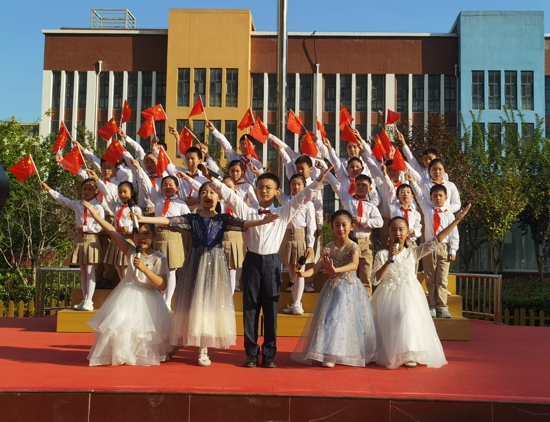 “起來,不愿做奴隸的人們,把我們的血肉筑成我們新的長城......”迎著初升的朝陽,外國語小學全體師生齊聚操場,在雄壯的國歌聲中五星紅旗冉冉升起,師生整齊列隊、齊唱國歌,堅定的眼神中飽含著對黨的無限忠誠和對祖國的滿腔熱愛。
