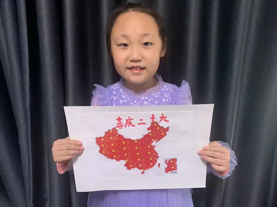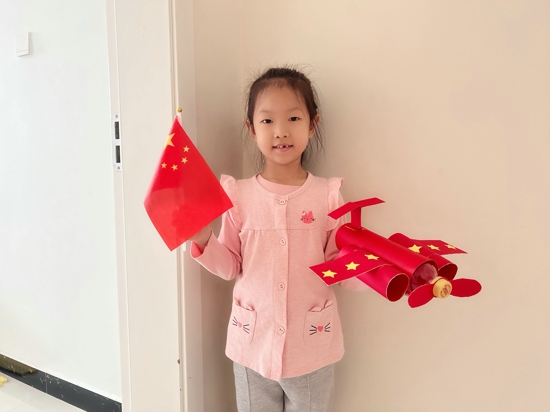 “我用手頭現(xiàn)有材料,用色卡紙制作手工飛機(jī),裝飾上黃色五角星,這樣,一架充滿中國元素的飛機(jī)就完成了。雖然看上去簡單,卻包含著我對祖國的熱愛。我希望祖國越來越繁榮昌盛!”三二班的石依諾說到。