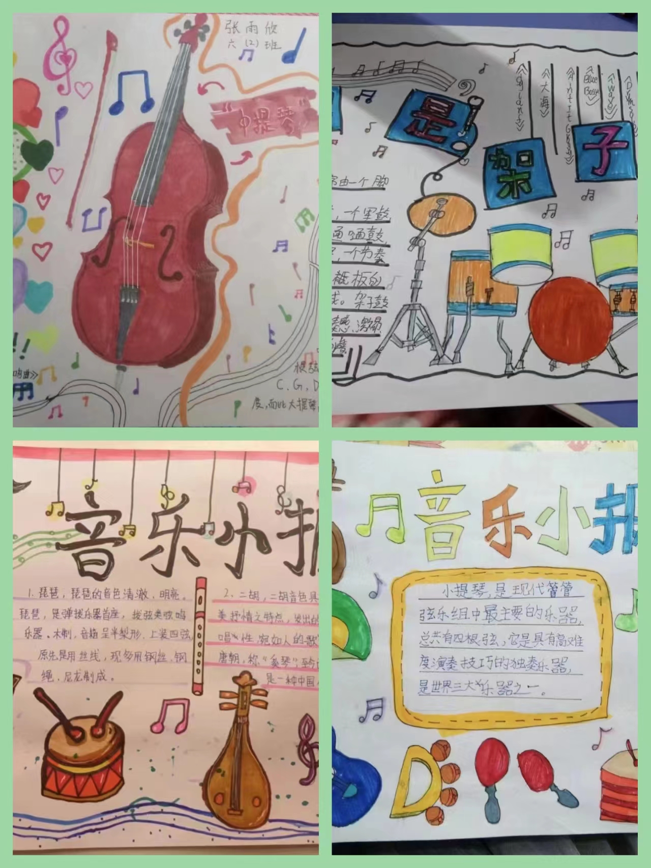 在音樂(lè)課上,同學(xué)們了解了不同種類的西洋管弦樂(lè)器,朱老師號(hào)召孩子們手繪西洋樂(lè)器的手抄報(bào)。同學(xué)們上交的作業(yè)排版整齊,色彩鮮艷。