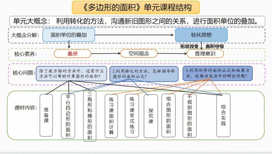 接著,第二組由季艷枝老師進行匯報。對核心素養(yǎng)進行再次整合,保留了推理意識和空間觀念,對量感究竟是否保留提出疑問!最后季老師呈現(xiàn)了清晰明了的單元課程結(jié)構(gòu)圖為后續(xù)的單元整體教學研究提供了明晰的思路。