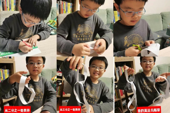 為了更好地培養(yǎng)孩子們學(xué)習(xí)時(shí)鐘知識(shí)的興趣,一年級(jí)開(kāi)展了“創(chuàng)意鐘面”設(shè)計(jì)等活動(dòng)。“創(chuàng)意鐘面”設(shè)計(jì)活動(dòng)中,孩子們發(fā)揮想象、大膽設(shè)計(jì),利用卡紙、廢棄紙板等物品做成了各式各樣精致的鐘面。讓數(shù)學(xué)在生動(dòng)、活潑、實(shí)踐的操作活動(dòng)中,遠(yuǎn)離枯燥,煥發(fā)光彩。四年級(jí)開(kāi)展了“莫比烏斯帶的制作與探究”實(shí)踐活動(dòng)。學(xué)生紛紛動(dòng)手制作,捏著一根長(zhǎng)方形紙條的一端,將另一端扭轉(zhuǎn)180°,再首尾粘貼起來(lái),在它的二等分、三等分處剪開(kāi)會(huì)變成什么樣呢?激發(fā)了學(xué)生探求數(shù)學(xué)知識(shí)的欲望,感受數(shù)學(xué)的神奇所在。