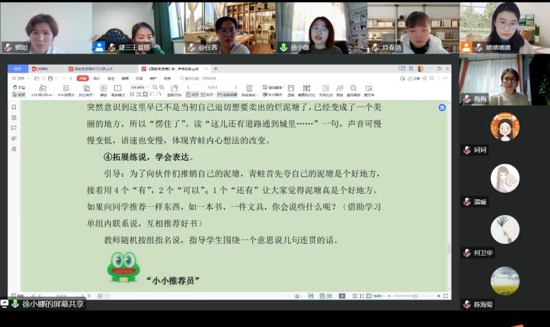 徐小娜老師以《青蛙賣泥塘》為例,緊扣主題,依托單元大情境——六一節(jié)目展演,不僅設計了有趣的活動,如小青蛙過河——生字檢測、小青蛙賞花——詞語檢測……,而且聚焦問題串——誰賣?賣給誰?為什么買?賣出去了嗎?為什么……精心設計了學生手冊及評價量表,為演好故事打下堅實的基礎。趙新婷和肖春艷老師則以《小毛蟲》為例分享第八九課時教學設計。趙老師基于學情的深入分析,采用“對比”的方法,課始以昆蟲生機勃勃和小毛蟲慵懶的圖片感知小毛蟲的特點,然后引領(lǐng)學生初讀課文,走進小毛蟲……......激發(fā)學生閱讀興趣。肖老師作為接力賽的第三棒,設置有趣的活動,有效引導學生自主學習,借助關(guān)鍵信息完整講述故事,整個教學設計環(huán)環(huán)相扣,層層遞進。