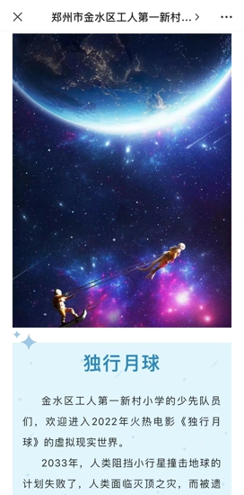 “2033年,人類阻擋小行星撞擊地球的計(jì)劃失敗了,人類面臨滅頂之災(zāi),而被遺忘在月球上的你(中等動(dòng)物研究員獨(dú)孤月)幸運(yùn)的活了下來,成為人類‘最后的希望’。為了能在月球更好地存活,你必須開始鍛煉生存技能,F(xiàn)在,讓我們跟著××班探月指戰(zhàn)員的腳步,學(xué)習(xí)月球生存技能吧!”同學(xué)們的生活活動(dòng)以2022年火熱電影《獨(dú)行月球》為情境展開,按照班級(jí)進(jìn)行勞動(dòng)技能展示。同學(xué)們化身小小探月員,展示的同學(xué)們則化身探月指戰(zhàn)員,用生動(dòng)的語言、科幻的背景,引領(lǐng)同學(xué)們帶著任務(wù),帶著興趣進(jìn)入勞動(dòng)的世界。