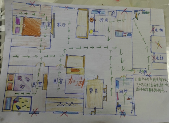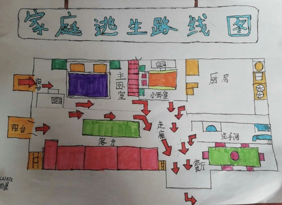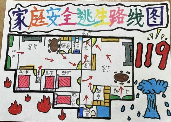 首先,學生們根據(jù)自己家樓層特點找到正確的逃生出口,然后,清晰地標注出每一條逃生路線,最后,詳細地繪出火災初起時的應對措施,如及時撥打119,避開電梯從樓梯逃生等,可謂精彩紛呈。