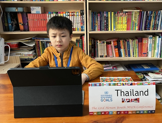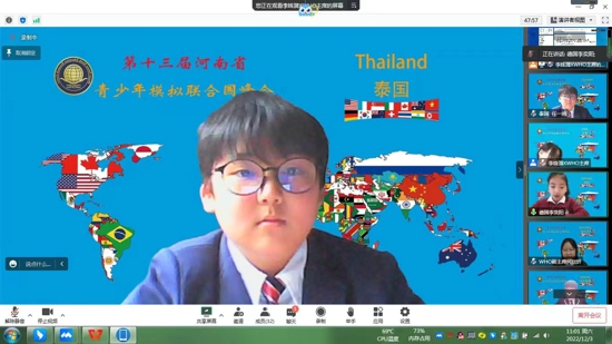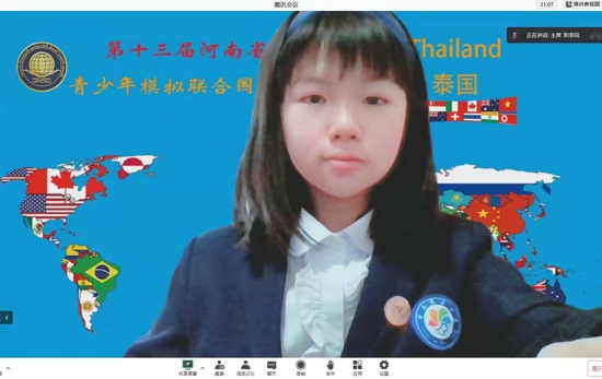 中新河南網(wǎng)12月7日電(吳勇強(qiáng) 任鈺童)12月3日,為期兩天的第十三屆河南省青少年模擬聯(lián)合國(guó)峰會(huì)在線上拉開了帷幕。鄭州市中原區(qū)百花藝術(shù)小學(xué)五名學(xué)生代表作為泰國(guó)外交官參加了此次活動(dòng),與河南省26所中小學(xué)和教育單位的近500名學(xué)生一起模擬聯(lián)合國(guó)的議事規(guī)則,深入探討聯(lián)合國(guó)可持續(xù)發(fā)展目標(biāo)。