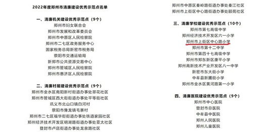 中新河南網(wǎng)12月14日電(吳勇強 李鵬圖)近日,鄭州市紀(jì)委監(jiān)委公布了2022年度鄭州市清廉建設(shè)優(yōu)秀示范點獲評單位名單,上街區(qū)中心路小學(xué)榜上有名!