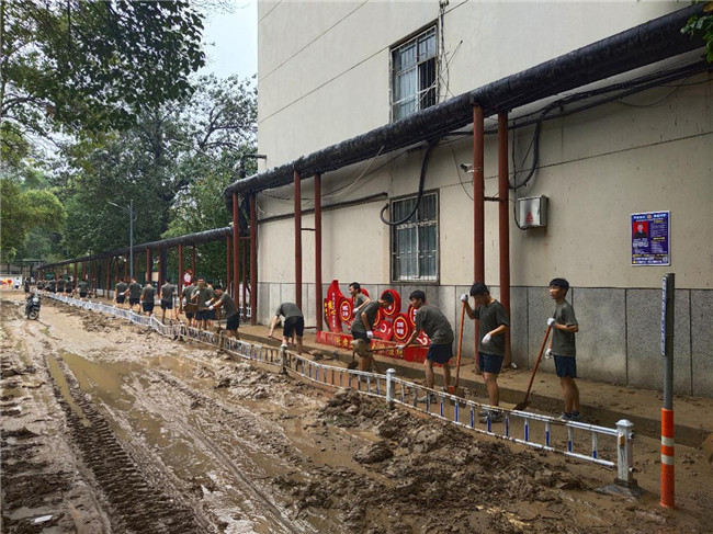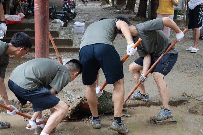 汗水濕透衣背。7月22日上午9時(shí),在河南中醫(yī)藥大學(xué)武裝部、保衛(wèi)處負(fù)責(zé)同志和15名軍訓(xùn)教官的帶領(lǐng)下,85名軍訓(xùn)隊(duì)員抵達(dá)東明路校區(qū)。他們根據(jù)現(xiàn)場(chǎng)情況,快速制定抗洪排水方案,進(jìn)行了周密部署,并迅速投入清理道路泥土等抗洪排水工作。校區(qū)內(nèi)道路布滿淤泥、路面大面積被淹,泥漿和著雨水沖出來(lái)的垃圾鋪滿路面。同志們不怕臟,不怕苦,士氣高昂,精神抖擻,齊心協(xié)力清淤泥,保暢通。食堂、宿舍樓、道路上,隨處都能看到大家揮灑汗水的身影。3個(gè)小時(shí)過(guò)去了,在大家分秒必爭(zhēng)、全力奮戰(zhàn)下,東明路校區(qū)積水清理完畢,路面煥然一新,各場(chǎng)地整潔干凈,解決了困擾師生的校區(qū)大面積被淹的困境。“軍訓(xùn)官兵、真是好樣的!現(xiàn)在的年輕人,真中!”現(xiàn)場(chǎng)不時(shí)發(fā)出感動(dòng)、贊美聲。