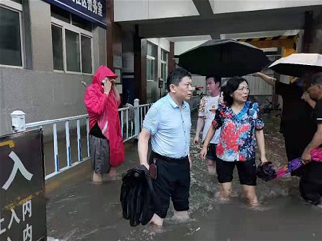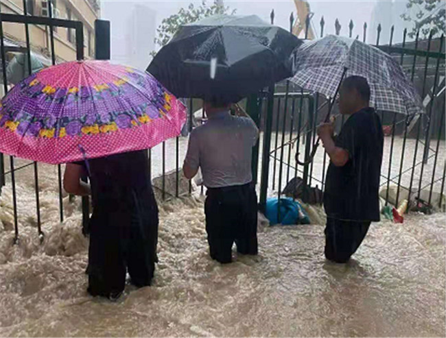 戰(zhàn)斗驚心動魄。20日下午14時30分,由于雨勢迅猛,東明路校區(qū)排水能力有限,校區(qū)積水明顯增加,最深處約50cm。部門負(fù)責(zé)人王浩然、張瑩兩位同志冒雨對校區(qū)內(nèi)的主要交通道路、學(xué)生宿舍、餐廳、超市、青年公寓樓,家屬院等區(qū)域進行防澇防汛排查,經(jīng)分析研判,認(rèn)為是由于進修樓通道路面排水受阻導(dǎo)致。為保證校區(qū)排水通暢,他們立即組織保衛(wèi)處人員利用木棒,梯子等工具對疫情防控時封閉的校區(qū)北門進行破拆,并安排專人密切監(jiān)視水位變化情況。在大家的共同努力下,校區(qū)積水奔涌而出,水位明顯下降。下午16時,由于降雨持續(xù),校區(qū)南側(cè)金水河漫堤,校園積水迅速增加!困難面前,兩位同志立即進行了工作分工,王浩然趟著齊腰深的積水,負(fù)責(zé)查看主要排水口情況,張瑩同志負(fù)責(zé)查看學(xué)生宿舍樓情況。此時家屬院15、16號樓地下室已沒入水中,東南處積水已達(dá)到肩膀處,約150cm,學(xué)生餐廳一樓水深至腰部,2號學(xué)生宿舍樓一層宿舍則全部進水,積水深至床板。17時左右,金水河水在沖毀河道管理處房屋后倒灌入校園內(nèi),校區(qū)積水迅速上升,最深處達(dá)160cm。大量河水倒灌造成東明校區(qū)兩棟宿舍樓、學(xué)生餐廳、配電房、洗浴中心均有不同程度進水,平均水深40cm。其中2號學(xué)生宿舍樓距離金水河潰口僅有4米,一樓宿舍全部被淹,水深70cm,物料漂浮,滿目狼藉,情況萬分危急,形勢異常嚴(yán)峻!按照校黨委書記別榮海、校長許二平等校領(lǐng)導(dǎo)的要求,學(xué)校東明辦、保衛(wèi)處、后勤服務(wù)中心等部門的同志統(tǒng)籌安排、通力協(xié)作,克服重重困難,迅速對學(xué)生進行了轉(zhuǎn)移安置,全力確保師生安全;同時,派專人嚴(yán)密監(jiān)視金水河潰口情況,想盡一切辦法防止水位繼續(xù)上升,造成更加嚴(yán)重的后果。晚上19時許,400余名學(xué)生全部轉(zhuǎn)移安置完畢,同時切斷了校區(qū)電源,對學(xué)校超市、洗浴中心,餐廳等場所的職工進行了安全疏散。20日夜間,在防汛設(shè)備、人員物資缺乏,無法聯(lián)系公安消防等外部救援力量的危急情況下,王浩然、張瑩、楊結(jié)實等帶領(lǐng)保衛(wèi)處等部門的同志,利用床板等現(xiàn)有工具多次嘗試圍堵金水河潰口,但由于潰口較大,水流湍急,一直未能成功。為防止校區(qū)積水情況進一步惡化,他們徹夜堅守崗位,嚴(yán)密監(jiān)視潰口及校園各處情況,保證在汛情發(fā)展后能夠第一時間進行處置。