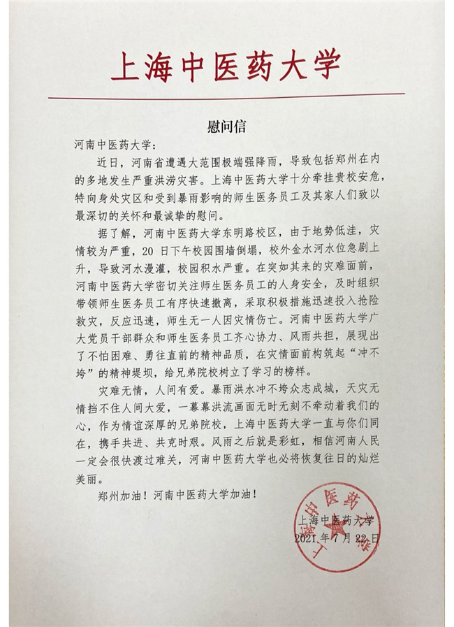 中新河南網(wǎng)7月25日電(魏豪)編者按:2021年7月22日,一封飽含兄弟院校深厚情誼的上海中醫(yī)藥大學(xué)給河南中醫(yī)藥大學(xué)的慰問(wèn)信從一千公里之外的上海深情到來(lái)!信中,上海中醫(yī)藥大學(xué)向身處災(zāi)區(qū)和受到暴雨影響的河南中醫(yī)藥大學(xué)師生、醫(yī)務(wù)員工及其家人們致以最深切的關(guān)懷和最誠(chéng)摯的慰問(wèn),對(duì)河南中醫(yī)藥大學(xué)廣大黨員干部群眾和師生醫(yī)務(wù)人員齊心協(xié)力、風(fēng)雨共擔(dān),采取有力措施保護(hù)師生生命財(cái)產(chǎn)安全和取得的成效給與了鼓勵(lì)、激勵(lì),對(duì)兩所大學(xué)攜手共進(jìn)、共克時(shí)艱給與了堅(jiān)強(qiáng)有力的支持,滿滿的深情厚誼!滿滿的關(guān)心牽掛!滿滿的祝愿祝福!滿滿的能量力量!在全校上下眾志成城防汛救災(zāi)的關(guān)鍵時(shí)刻,上海中醫(yī)藥大學(xué)發(fā)來(lái)的慰問(wèn)信,為河南中醫(yī)藥大學(xué)全面做好防汛救災(zāi)工作注入了強(qiáng)勁力量,進(jìn)一步堅(jiān)定了全校師生防汛救災(zāi)、共克時(shí)艱的信心和決心。