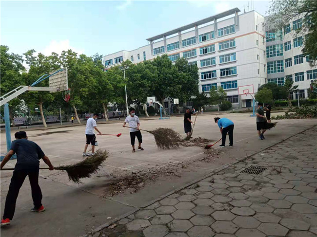 “你們?nèi)セ@球場清理綠地上的枯枝落葉,我們?cè)谶@邊清掃路面雜物……”楊寶進(jìn)一行帶領(lǐng)教師志愿者,從學(xué)生公寓門口出發(fā),分為南、北兩隊(duì),分別對(duì)校園內(nèi)、第一家屬區(qū)、第二家屬區(qū)等地汛后遺留的垃圾物進(jìn)行全面清理打掃。老師們拿起掃帚,一邊清理路面的淤泥,一邊清掃路面的落葉及雜物,力爭盡快恢復(fù)校容校貌。清掃過程中,大家分工明確,方法得當(dāng),效果明顯,校園的路面、大門口、教學(xué)樓廣場等處,很快恢復(fù)了往日的良好面貌。