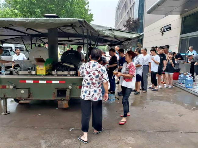 受暴雨洪災(zāi)影響,如何在停水停電狀態(tài)下保障餐食供應(yīng)成為關(guān)鍵難題。交院技術(shù)集團(tuán)臨時(shí)成立炊事班,啟用了事先由百力誠信息科技有限公司捐贈的"炊事神器"——軍用移動炊事車(“移動廚房”),滿負(fù)荷烹飪運(yùn)轉(zhuǎn),解決了停水停電狀態(tài)下的熱食供應(yīng)。