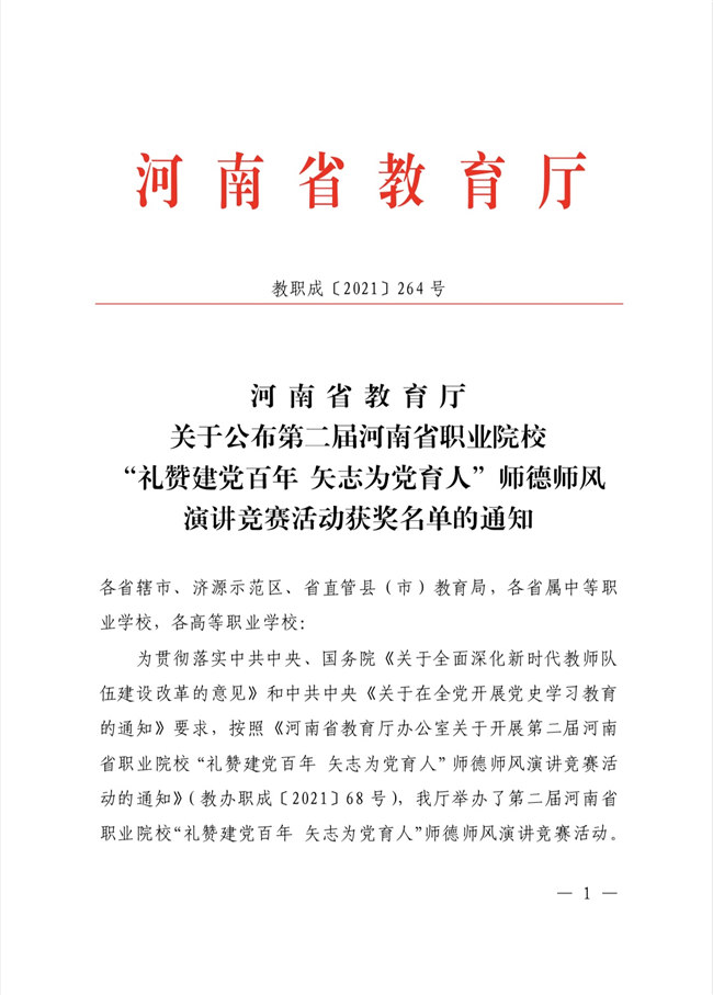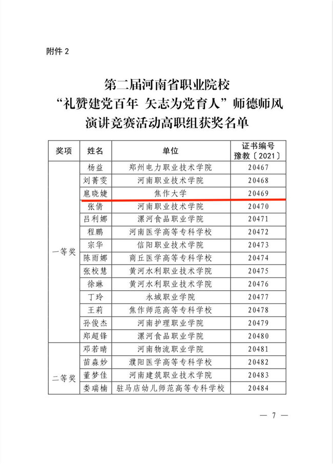 中新河南網(wǎng)7月30日電(魏豪)為貫徹落實中共中央、國務院《關于全面深化新時代教師隊伍建設改革的意見》和中共中央《關于在全黨開展黨史學習教育的通知》要求,河南省教育廳于近期開展了第二屆河南省職業(yè)院校“禮贊建黨百年 矢志為黨育人”師德師風演講競賽活動。焦作大學人文學院教師扈曉婕獲得高職組一等獎,高婷婷獲得二等獎。