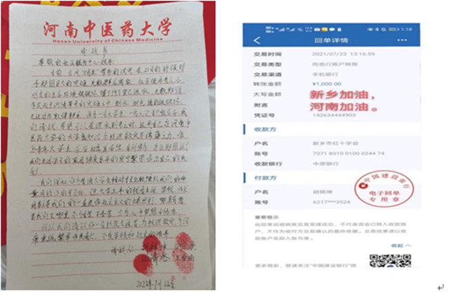 管理學(xué)院2018級學(xué)生胡錦坤聽聞鄭州市汛情嚴重,從家鄉(xiāng)返鄭后,在無水無電的出租屋里,以河南中醫(yī)藥大學(xué)入黨積極分子的身份寫下了申請加入抗洪救災(zāi)志愿者行列的請戰(zhàn)書。第一時間向社區(qū)請戰(zhàn)加入志愿者行列,疏散群眾、發(fā)放救災(zāi)物資、幫助老人搬出被泡物資、疏通道路等。鄭州汛情稍有緩解,新鄉(xiāng)又下起了大暴雨,胡錦坤盡己所能,把攢下來的1000元錢匯給了新鄉(xiāng)紅十字會用于救災(zāi)。