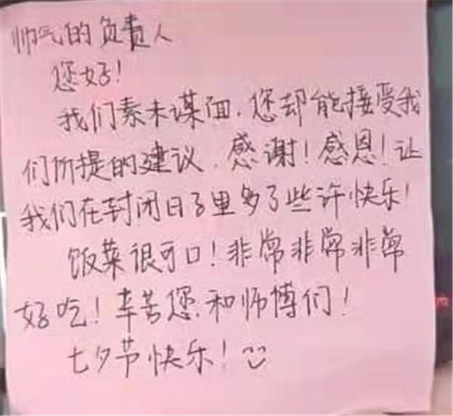 中新河南網(wǎng)8月18日電(魏豪 白雪玲)“帥氣的負(fù)責(zé)人,您好!我們素未謀面,您卻能接受我們的建議......讓我們在封閉的日子里多了些許快樂!飯菜很可口,非常非常好吃!......七夕節(jié)快樂!”