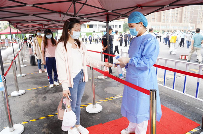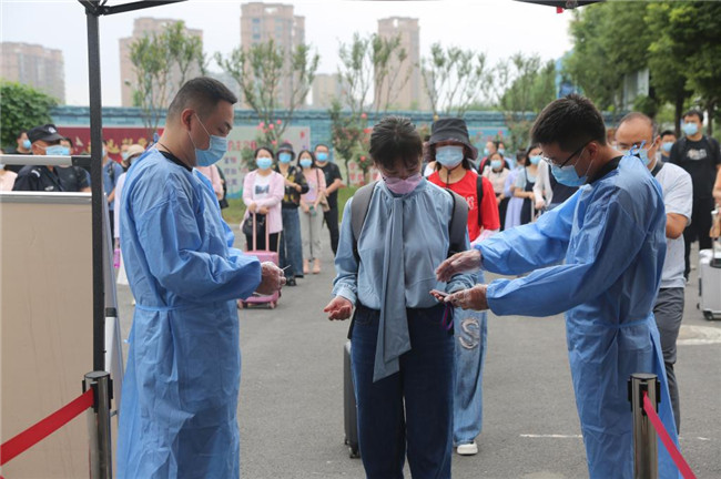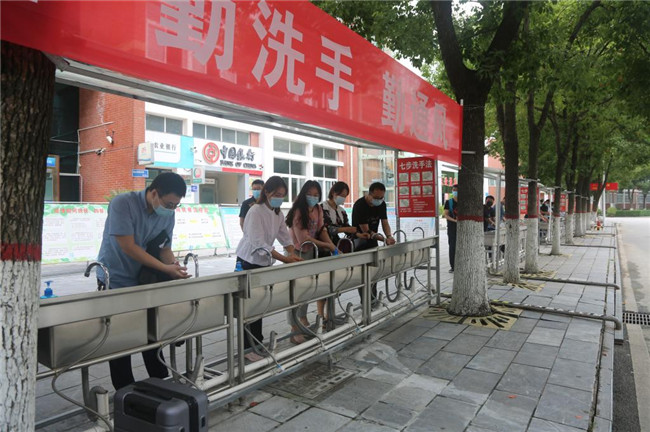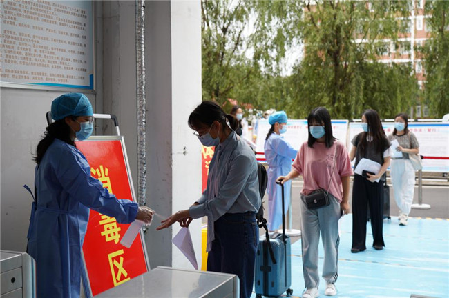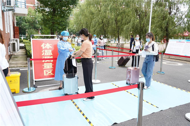 在學(xué)校南大門,防疫工作人員恪盡職守,入校流程規(guī)范嚴謹。學(xué)生持學(xué)生證或校園一卡通進行身份核驗,出示通信形成大數(shù)據(jù)卡、防疫健康信息碼和48小時內(nèi)核酸檢測陰性證明,進行測溫以及行李、腳底和手消毒,更換口罩后進入校園。