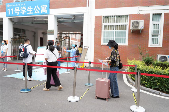 在學(xué)生公寓,學(xué)生進入公寓的流程及注意事項等展板迎面可見,學(xué)生陸續(xù)報到入住,工作人員在學(xué)生公寓入口處查驗學(xué)生身份及健康碼,完成體溫檢測、殺菌消毒等程序后,學(xué)生保持1米間距有序進入公寓。
