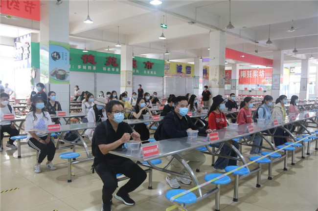 在餐廳門前,醒目的疫情防控宣傳展板、就餐流程圖、溫馨提示牌引導(dǎo)學(xué)生有序購餐、用餐。演練開始后,就餐人員按照指引洗手、排隊、測溫消毒后進入餐廳,在就餐窗口前一米線排隊取餐,單人單桌同向入座就餐。