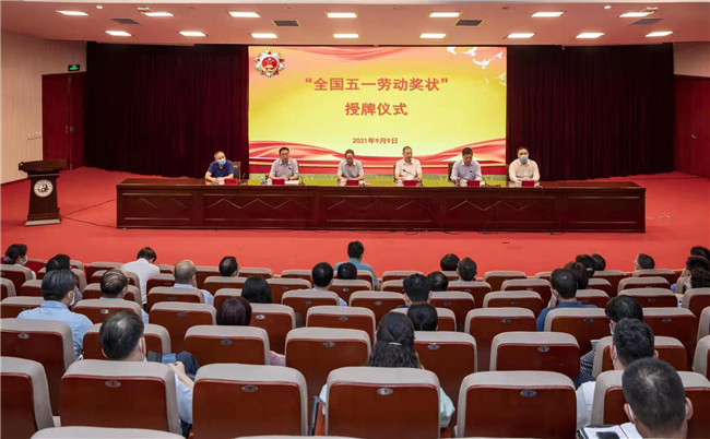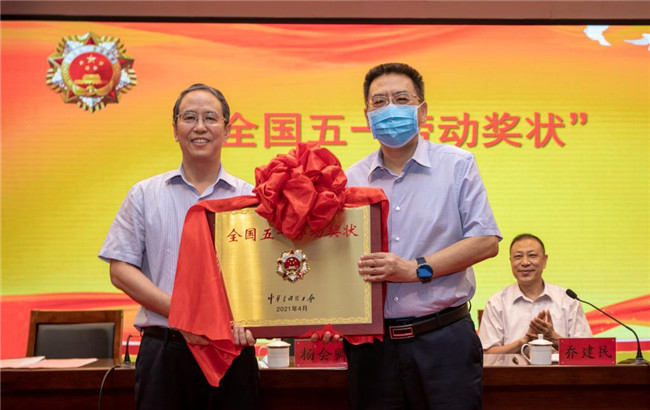 授牌儀式上,喬建民宣讀了中華全國總工會《關(guān)于表彰2021年全國五一勞動獎和全國工人先鋒號的決定》;楊會卿為學(xué)校頒發(fā)“全國五一勞動獎狀”,并代表省總工會向?qū)W校表示熱烈祝賀,向?qū)W校全體教職工致以教師節(jié)問候和美好祝福,向一直以來關(guān)心支持工會工作的學(xué)校領(lǐng)導(dǎo)和廣大教職工以及多年來為工會工作作出貢獻的廣大工會干部表示衷心的感謝。