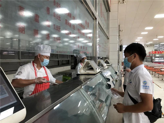 在餐廳北門口設置測溫點,安排專人負責維持餐廳秩序。學生經(jīng)洗手、測溫、消毒后有序從第一餐廳北門進入,進入餐廳后學生按地面標識線,沿同一方向順序移動,購買餐食后有序從東門出餐廳。