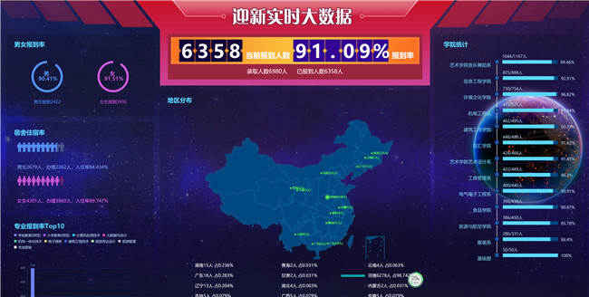 中新河南網(wǎng)9月24日電(魏豪)又是一年迎新季,漯河職業(yè)技術(shù)學(xué)院大屏幕上展示的迎新大數(shù)據(jù)格外亮眼,大數(shù)據(jù)實時動態(tài)展示了學(xué)生的報到率、學(xué)生的分布、宿舍入住、各院系報到情況等多維度與迎新報到相關(guān)的信息,一目了然,這是漯河職業(yè)技術(shù)學(xué)院近年來通過信息化支撐引領(lǐng)學(xué)校教育教學(xué)改革的一個側(cè)面。