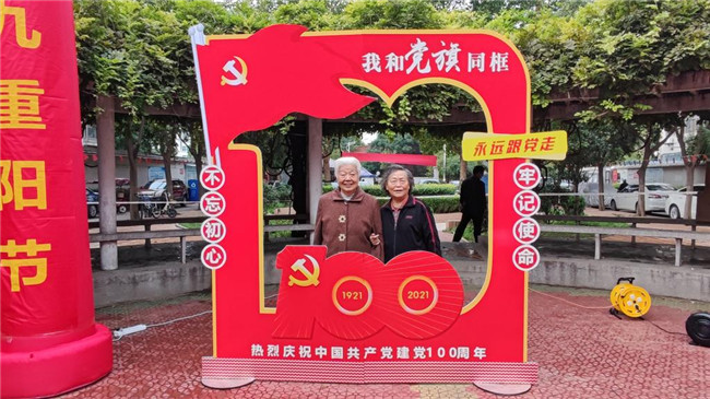 活動現(xiàn)場彩旗飄揚,“九九重陽節(jié)、濃濃敬老情”兩個鮮紅的燈籠氣柱矗立在場地正中,“我和黨旗同框”主題背景墻吸引了大家紛紛駐足留影,工作人員現(xiàn)場為大家沖印照片。