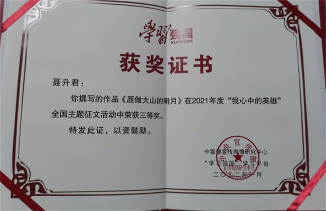 中新河南網(wǎng)1月25日電 近日,“學(xué)習(xí)強(qiáng)國(guó)”學(xué)習(xí)平臺(tái)舉辦的“我心中的英雄”主題征文活動(dòng)獲獎(jiǎng)名單公布,濮陽(yáng)職業(yè)技術(shù)學(xué)院體育健康學(xué)院2019級(jí)學(xué)生聶升君的作品《愿做大山的明月》獲三等獎(jiǎng)。