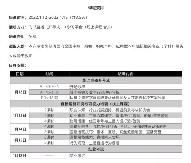 (巨量學全國“雙師型”線上專項師資培訓班課程安排表)