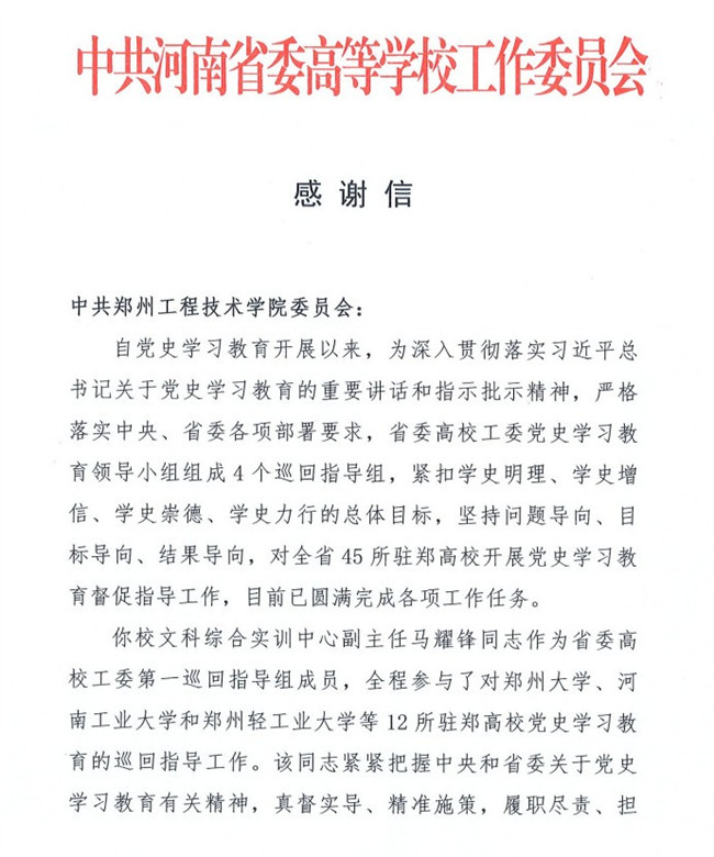 中共河南省委高等學校工作委員會 感謝信 中共鄭州工程技術(shù)學院委員會: