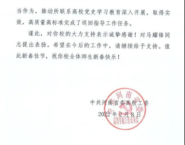 近日,省委高等學校工作委員會給鄭州工程技術(shù)學院黨委發(fā)來感謝信。信中對該校文科綜合實訓中心副主任馬耀鋒作為省委高校工委第一巡回指導(dǎo)組成員,在駐鄭高校黨史學習教育督導(dǎo)中緊緊把握中央和省委關(guān)于黨史學習教育有關(guān)精神,真督實導(dǎo)、精準施策,履職盡責、擔當作為,推動所聯(lián)系高校黨史學習教育深入開展,取得實效,高質(zhì)量高標準完成了巡回指導(dǎo)工作任務(wù)一事表達了感謝和贊賞。
